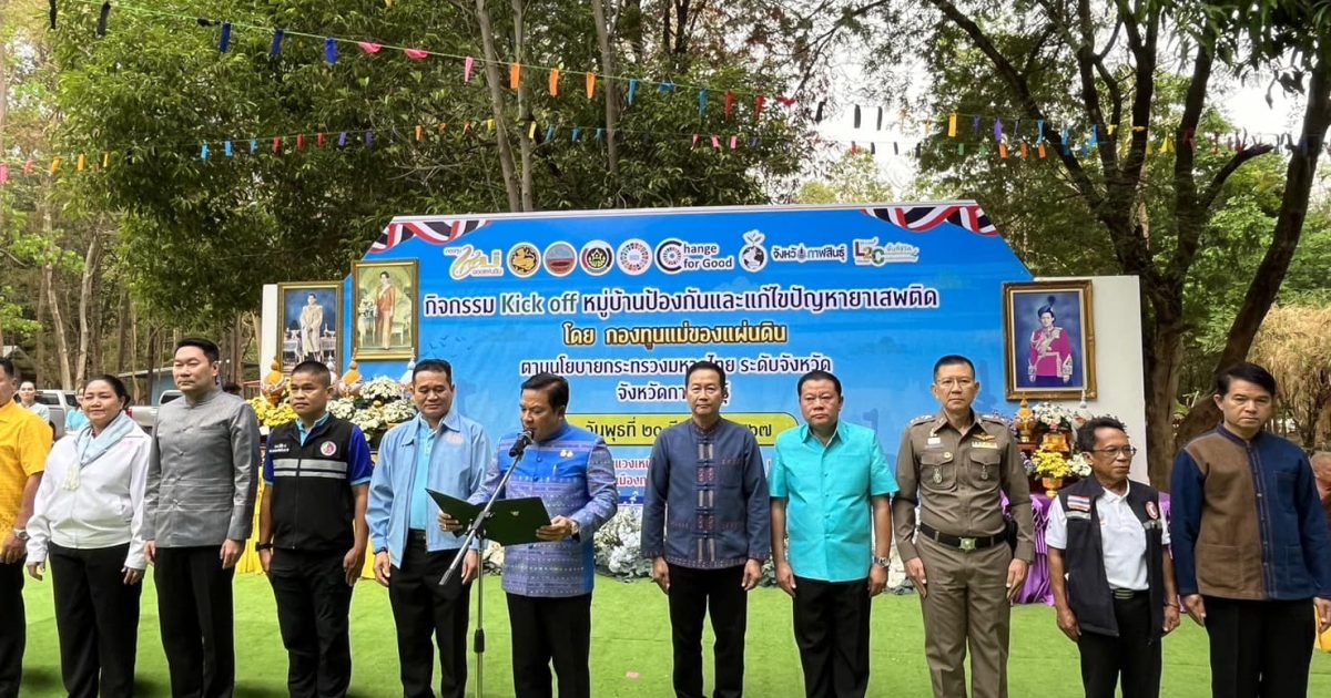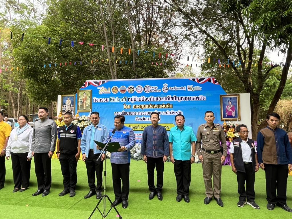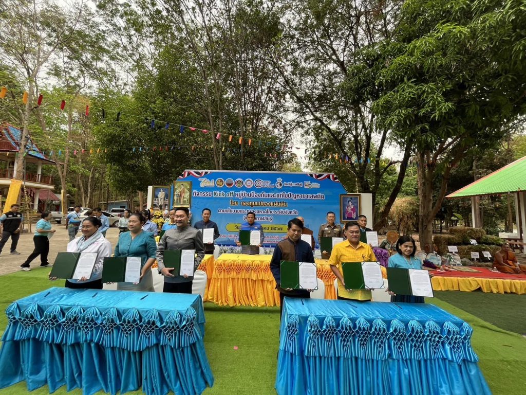 วันที่ 20 มี.ค.2567 เวลา 09.30 น. พล.ต.ต.ตรีวิทย์ ศรีประภา ผบก.ภ.จว.กาฬสินธุ์ มอบหมายให้ พ.ต.อ.อิทธิเดช สุนทร ผกก.สภ.เมืองกาฬสินธุ์ พร้อม พ.ต.ต.ชนะพล หาญอาษา สวป.(ชส.) สภ.เมืองกาฬสินธุ์ พร้อมกำลัง ชุด ชมส.เมืองกาฬสินธุ์ กิจกรรม kick off หมู่บ้านแก้ไขปัญหายาเสพติด โดยกองทุนแม่ของแผ่นดิน L2C Model (Life Land Creative Economy) พื้นที่เศรษฐกิจสร้างสรรค์ พร้อมลงนาม MOU ร่วมในการแก้ไขปัญหายาเสพติด ประกาศสงครามกับยาเสพติด โดยมี นายสนั่น พงษ์อักษร ผู้ว่าราชการจังหวัดกาฬสินธุ์เป็นประธาน พร้อมทั้งหัวหน้าส่วนราชการในจังหวัดกาฬสินธุ์ และสมาชิกกองทุนแม่ของแผ่นดินร่วมกิจกรรมรวม 500 คนจาก 135 ตำบลในจังหวัดกาฬสินธุ์ ณ ลานธรรม วัดป่าหนองแวงเหนือ หมู่ที่ 5 ตำบลภูปอ อำเภอเมืองกาฬสินธุ์ จังหวัดกาฬสินธุ์